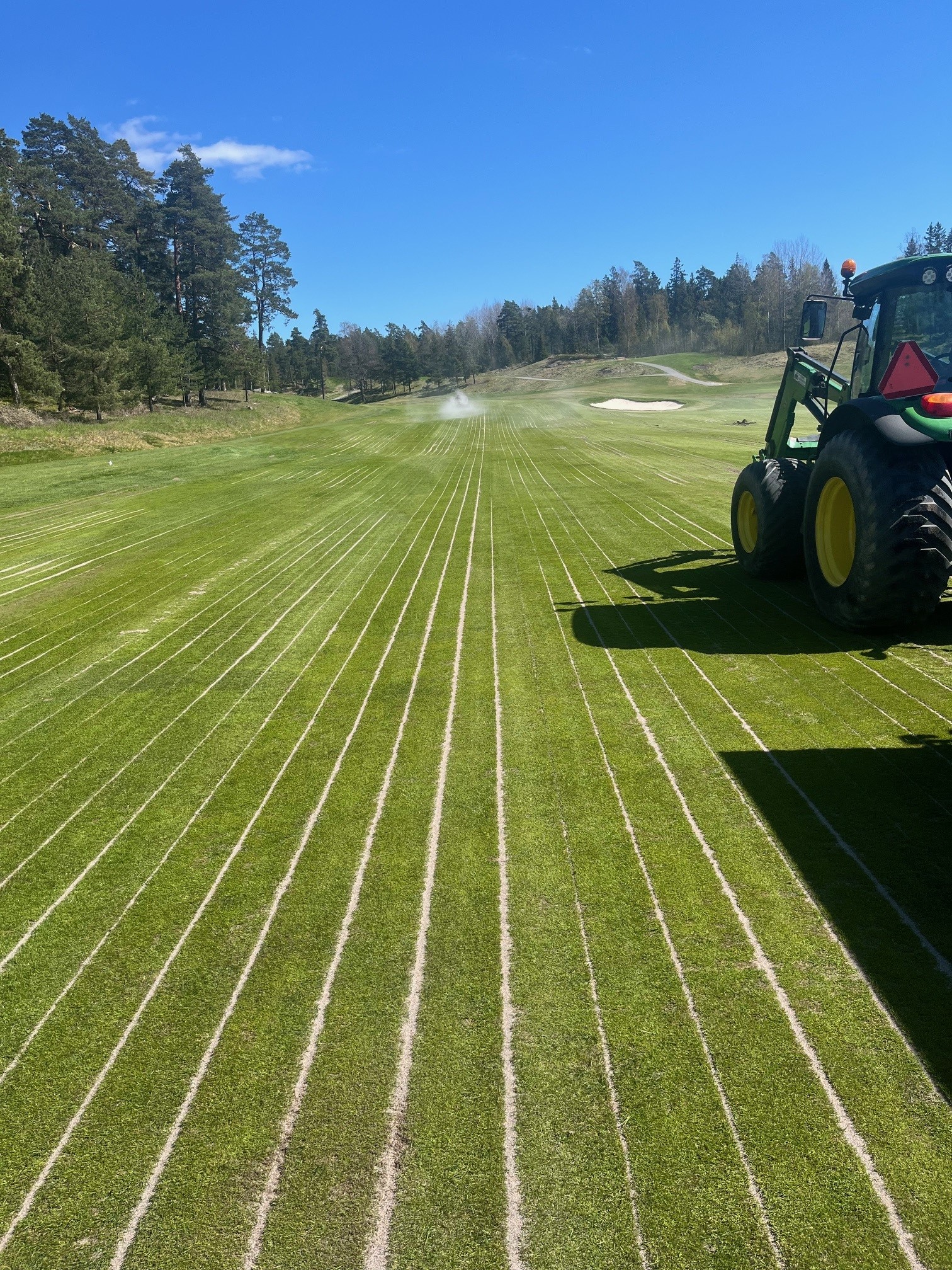 Vi har gjort stora insatser på fairways också denna vår. Vi har hyrt in en tjänst där man slitsdränerar ytan för att både få ner ny fräsch sand samt för att kunna transportera bort ytvatten. Vi körde denna maskin på hål 2, 14 och 17. Spåren efter maskinen är minimala och påverkar ej spelet nämnvärt.